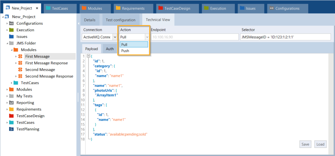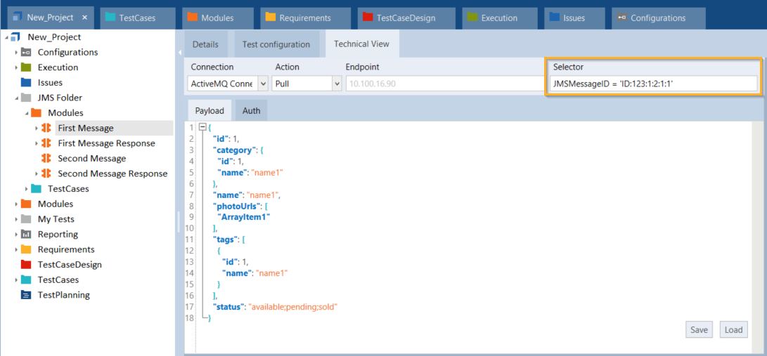 Wenn Sie eine JMS-Verbindung auf einem API-Modul im Tosca Commander verwenden, können Sie die Verbindungsdetails im Reiter Technische Ansicht bearbeiten.