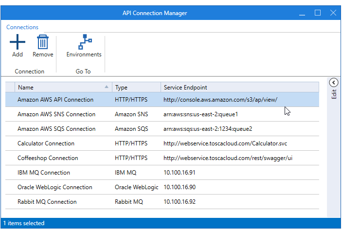 Im Reiter Connections im API Connection Manager können Sie Verbindungen hinzufügen oder entfernen und Verbindungsdetails bearbeiten.