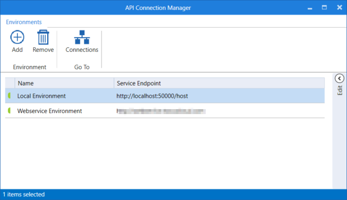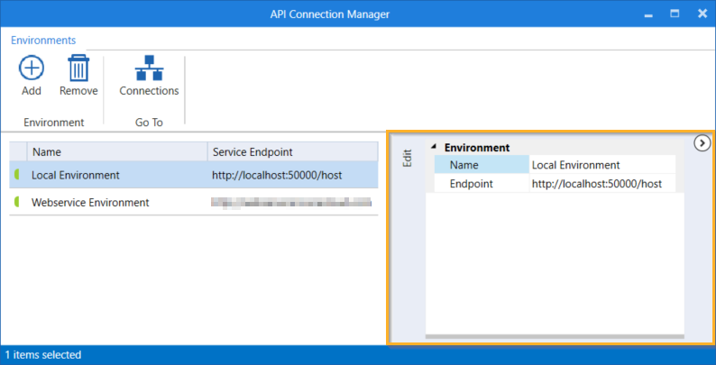 Sie können Ihre API-Environments im Reiter Environments des API Connection Manager verwalten. Verwenden Sie diese Option zum Hinzufügen oder Entfernen von Environments und zum Bearbeiten von Environment-Details.