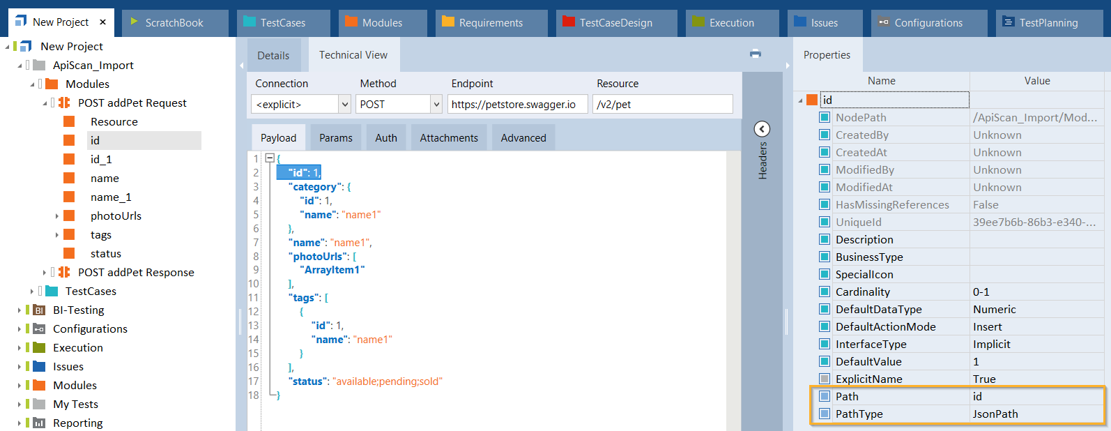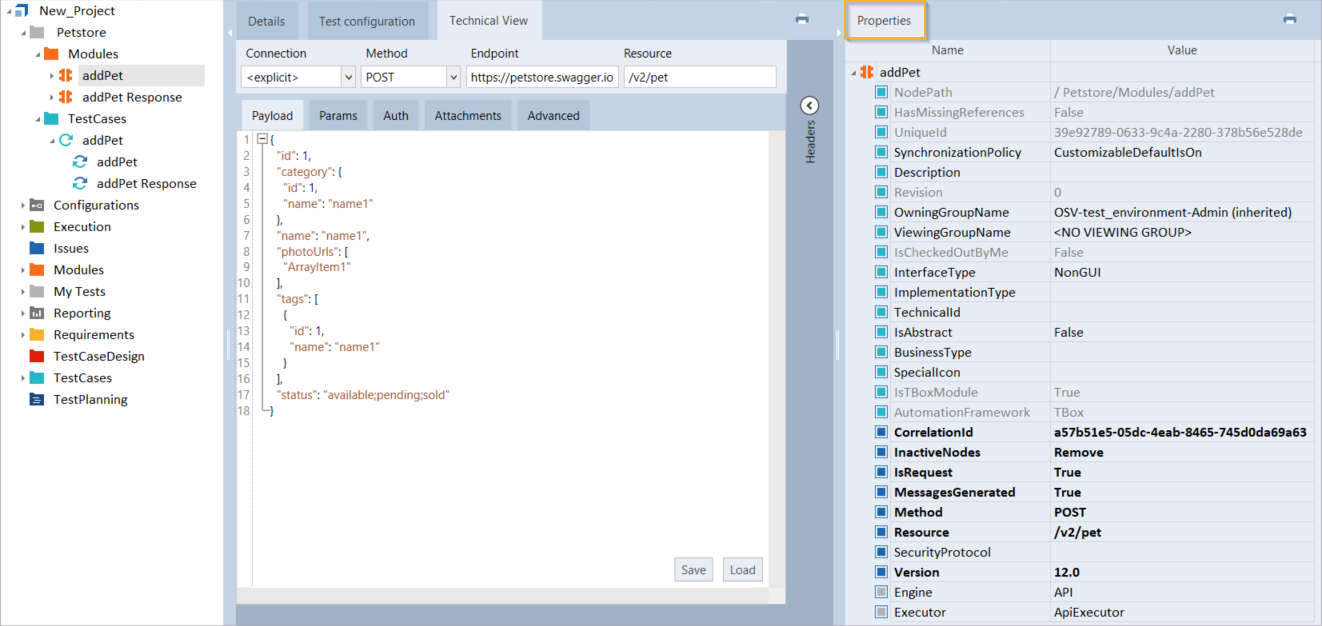 Der Bereich Properties im Tosca Commander zeigt alle Eigenschaften des ausgewählten API-Moduls an. Weitere Informationen zu den Moduleigenschaften finden Sie hier: siehe Kapitel " Standardeigenschaften von Modulen".
