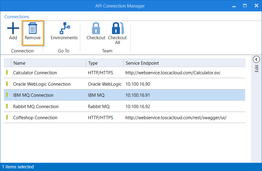 Wenn Sie eine Verbindung im API Connection Manager entfernen, wird diese auch aus dem Tosca Commander und API Scan entfernt.