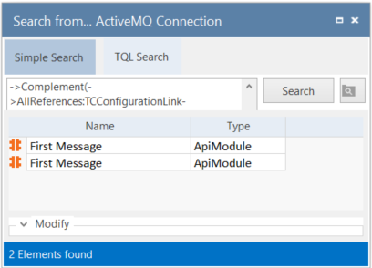 Die Suchfunktion zeigt eine Liste aller referenzierten Objekte im Tosca Commander.