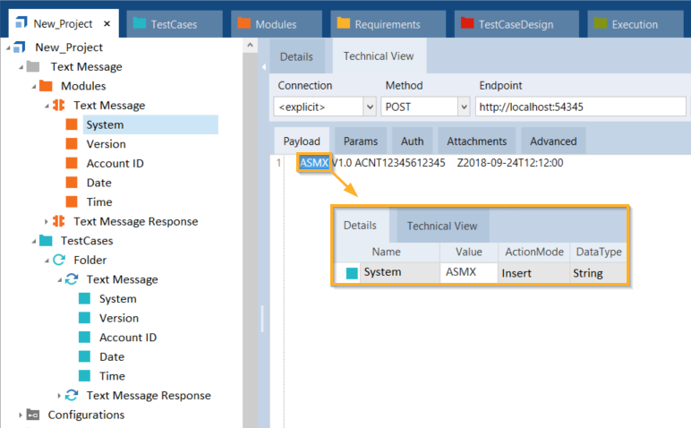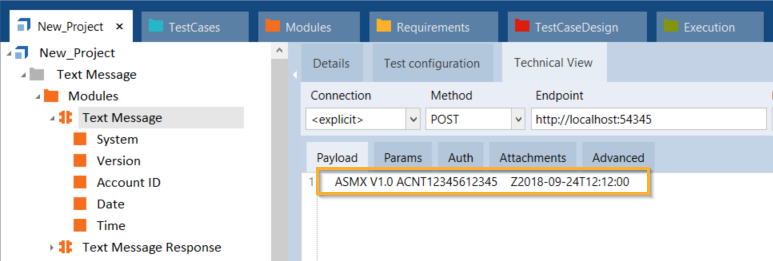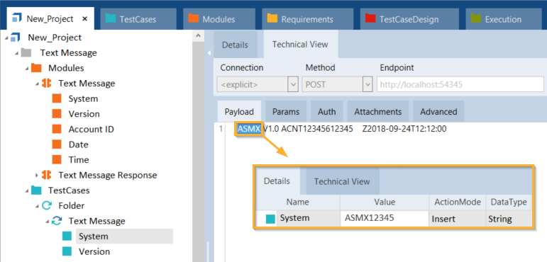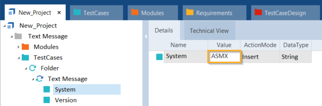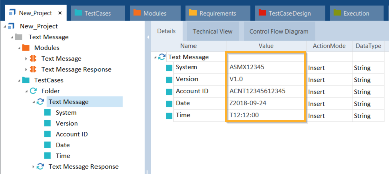 Um Textnachricht-Modulattribute in Ihren API-Testfällen zu steuern, passen Sie die Spalten Value und ActionMode wie hier beschrieben an: Kapitel " Modulattribute steuern".