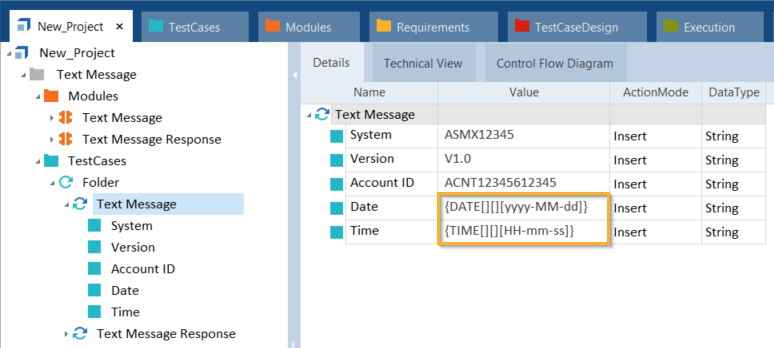 Testfall und seine XTestschrittwerte Dieser Testfall kann so wie er ist ausgeführt werden und das System überprüft die eingefügten Werte. Alternativ können Sie die Werte ändern. Wenn Sie z. B. beabsichtigen, den Testfall wiederholt zu verwenden. Dieser Testfall konzentriert sich auf den Zeitstempel, d. h. XTestschrittwerte Date und Time. Damit Sie diese Werte nicht selbst erzeugen müssen, können Sie für beide Werte dynamische Ausdrücke hinzufügen.