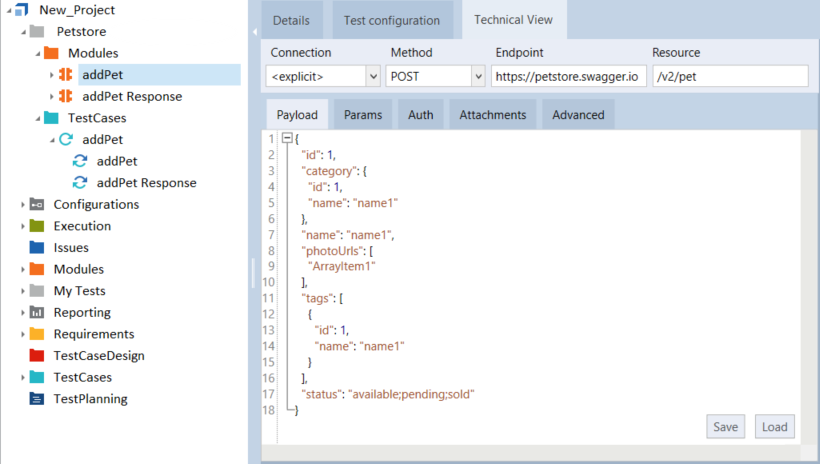 Wenn Sie ein API-Modul im Tosca Commander auswählen, wechselt die Ansicht automatisch zum Reiter Technische Ansicht. Er zeigt die gleichen Informationen wie der Nachrichtenabschnitt des API Scan und ermöglicht es Ihnen, Ihre Nachrichten auf die gleiche Weise zu bearbeiten.