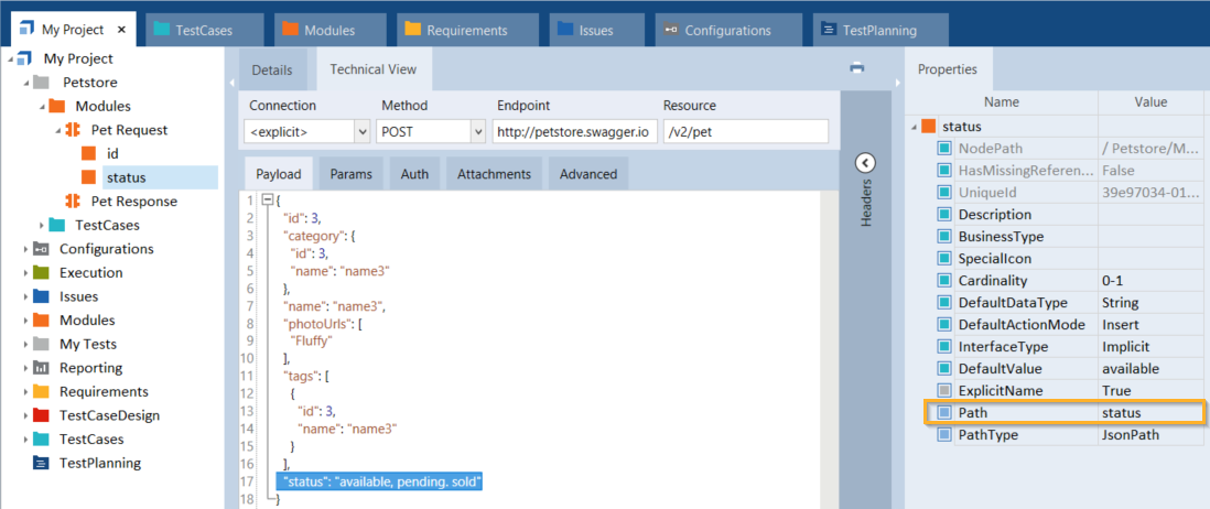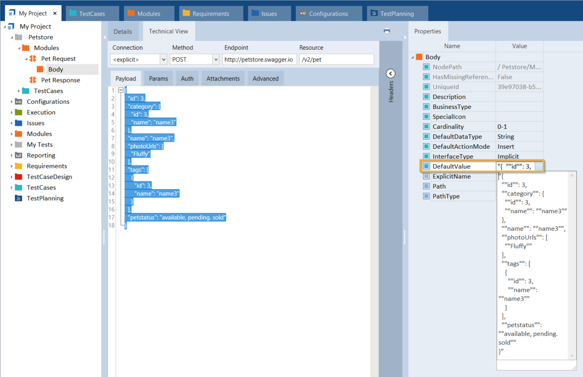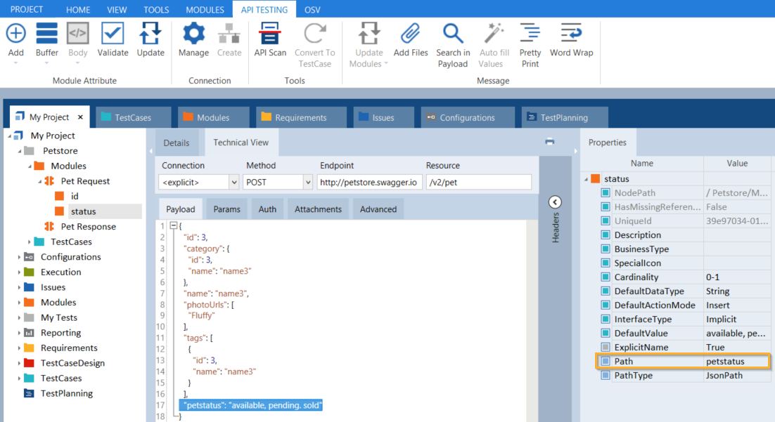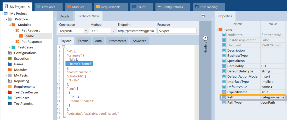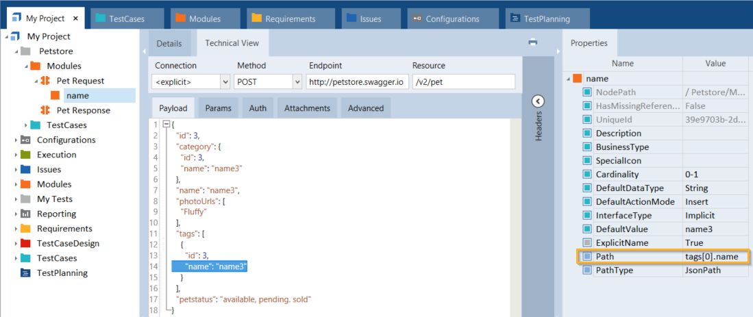 Tricentis Tosca übernimmt automatisch alle Änderungen, die Sie am Modul vornehmen, in die entsprechenden Nachrichten. Weitere Informationen zur Aktualisierung von API-Modulen und eine Videoanleitung finden Sie hier: siehe Kapitel " API-Module mit dem API Scan aktualisieren".