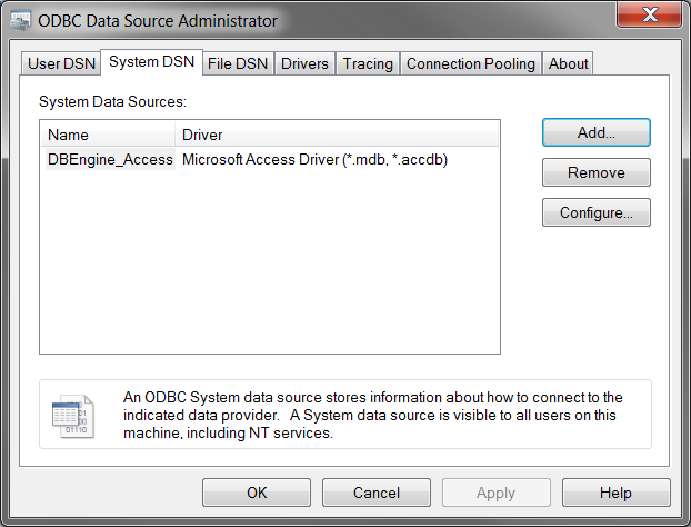 Öffnen Sie den ODBC-Datenquellen-Administrator über Systemsteuerung->Verwaltung->ODBC Data Sources.