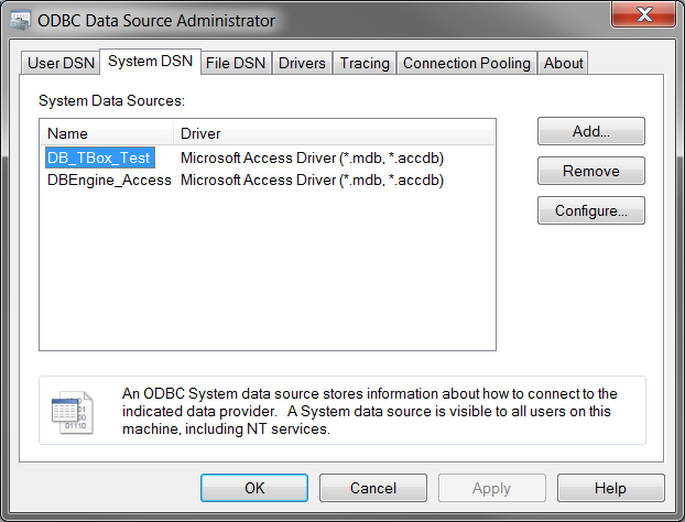 In unserem Beispiel enthält der Reiter System-DSN nun einen neuen Eintrag mit folgenden Werten: Name=DB_TBox_Test und Treiber=Microsoft Access Driver (*.mdb, *.accdb).