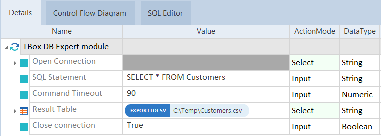 In diesem Beispiel exportiert Tosca die Ergebnistabelle Ihres SQL-Statements in die Datei Customers.csv unter C:\Temp.
