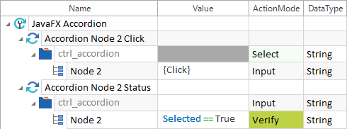 In diesem Beispiel erfolgt ein Mausklick im Accordion ctrl_accordion auf den Reiter Node 2. Im zweiten Testschritt wird geprüft, ob der Reiter Node 2 aufgeklappt ist.