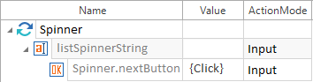 In diesem Beispiel wird ein ListItem Spinner Control listSpinnerString mit der Schaltfläche Spinner.nextButton gesteuert. Es wird mittels {Click} und der Aktion Input ein Klick auf die Schaltfläche mit dem Aufwärts-Pfeil ausgeführt, um das nächste Element auszuwählen.