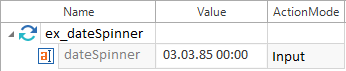 Der Wert des dateSpinner wird durch Eingabe eines neuen Wertes verändert. In den Testschrittwert dateSpinner wird der Wert 03.03.85 00:00 mit der Aktion Input eingetragen.