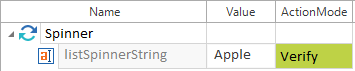 ListItem Spinner in der Applikation Es wird mit der Aktion Verify geprüft, ob das Element Apple ausgewählt ist.