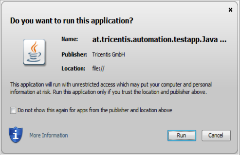 Abhängig von den Sicherheitseinstellungen Ihres Rechners kann das Java Runtime Environment beim erstmaligen oder erneuten Start einer Java Applikation die folgende Sicherheitsmeldung öffnen. Die Sicherheitsmeldung kann auch nach einem Update des Java Runtime Environment aufscheinen.
