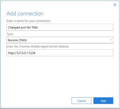 Wenn Sie eine Verbindung zu Remote (TMA) herstellen, geben Sie die Serveradresse des Tricentis Mobile Agent im Format http://<IP-Adresse>:<Portnummer>/ an.