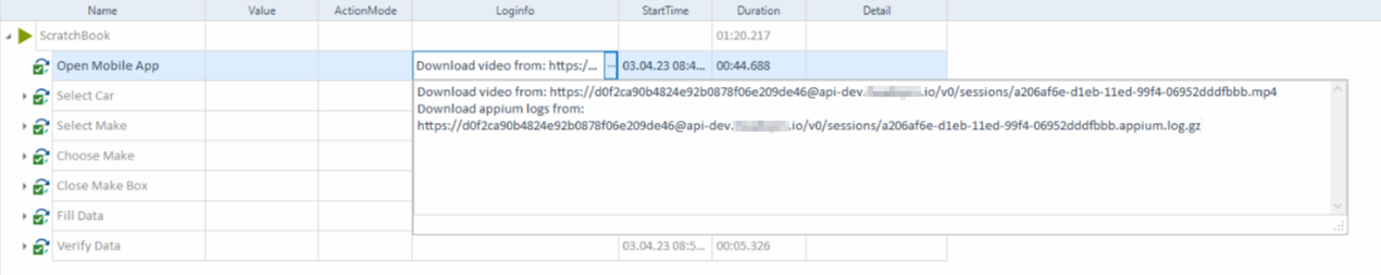 Für die TDC-Ausführung stehen Download-Links zur Videoaufzeichnung aus der Ausführung und den Appium-Logs zur Verfügung.