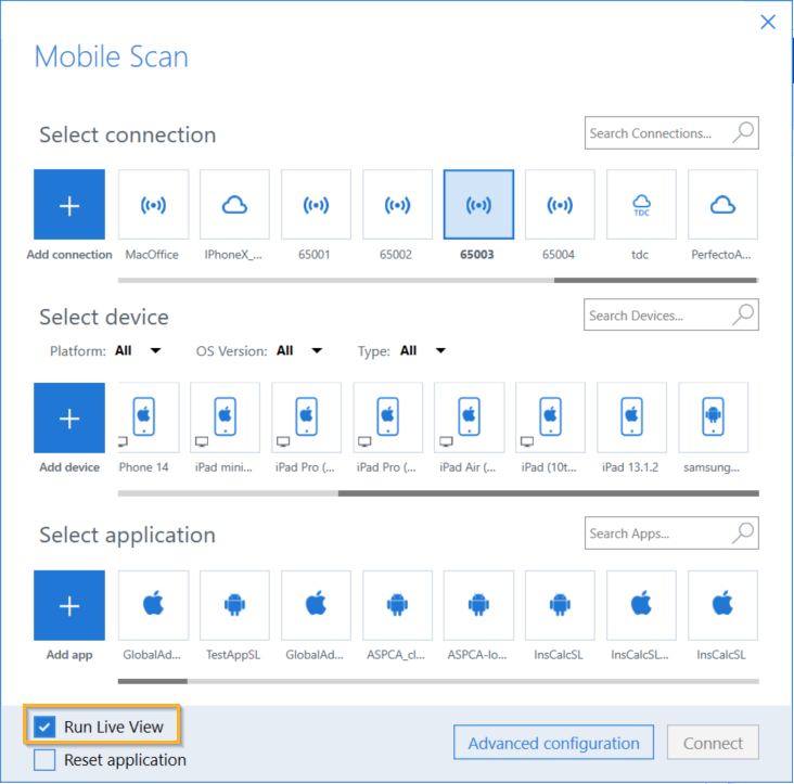 Kontrollkästchen Run Live View im Fenster Mobile Scan