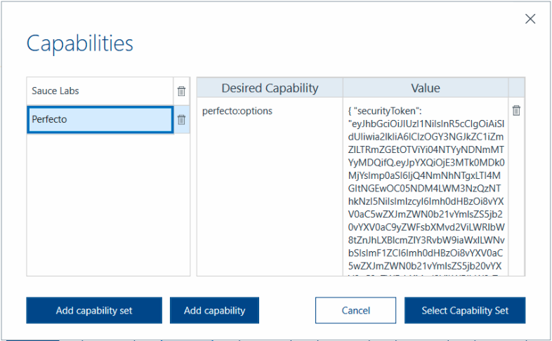 Beispielhafte Desired Capabilities für die Perfecto-Integration