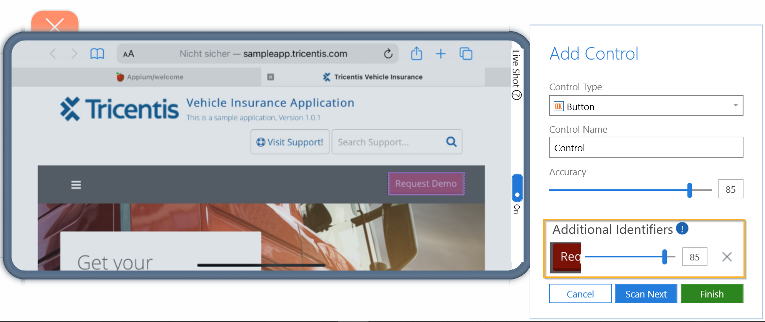 Das Referenzbild erscheint im Abschnitt Additional Identifiers im Fenster Add Control. Sie können nun seine Genauigkeit unter Accuracy einstellen, indem Sie den Schieberegler daneben bewegen.