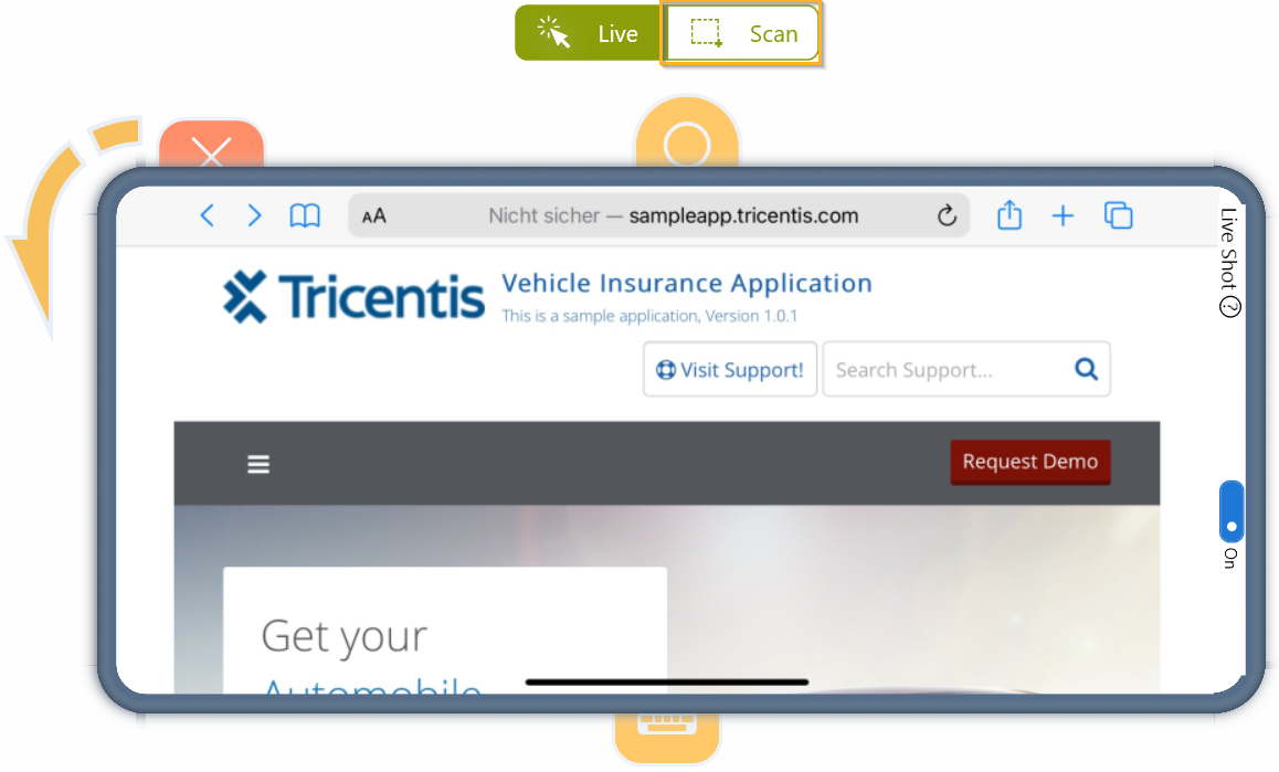 Tricentis Tosca öffnet automatisch die Live View mit einer Vorschau auf das Gerät und die Applikation. Standardmäßig befindet sich die Live View im Live-Modus, d. h. Sie können Live View-Interaktionen verwenden, um durch die mobile Applikation zu navigieren.