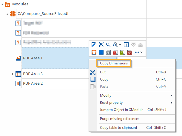 Klicken Sie mit der rechten Maustaste auf das Modulattribut für einen der markierten Bereiche und wählen Sie Copy Dimensions aus.