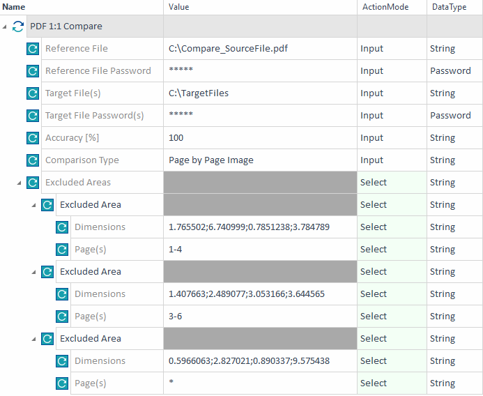 In diesem Beispiel vergleichen Sie den visuellen Inhalt einer passwortgeschützten PDF-Datei mit allen PDF-Dateien im Verzeichnis C:\TargetFiles. Da die Zieldateien in diesem Verzeichnis auch passwortgeschützt sind, geben Sie ihre jeweiligen Passwörter durch ein Semikolon getrennt ein. Darüber hinaus erwarten Sie eine 100%-ige Ähnlichkeit zwischen ihnen. Sie schließen drei Bereiche aus dem Vergleich aus: