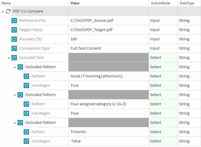 In diesem Beispiel vergleichen Sie nur den Text zwischen zwei PDF-Dateien und erwarten eine 100%ige Ähnlichkeit. Darüber hinaus schließen Sie drei verschiedene Textmuster aus dem Vergleich aus: