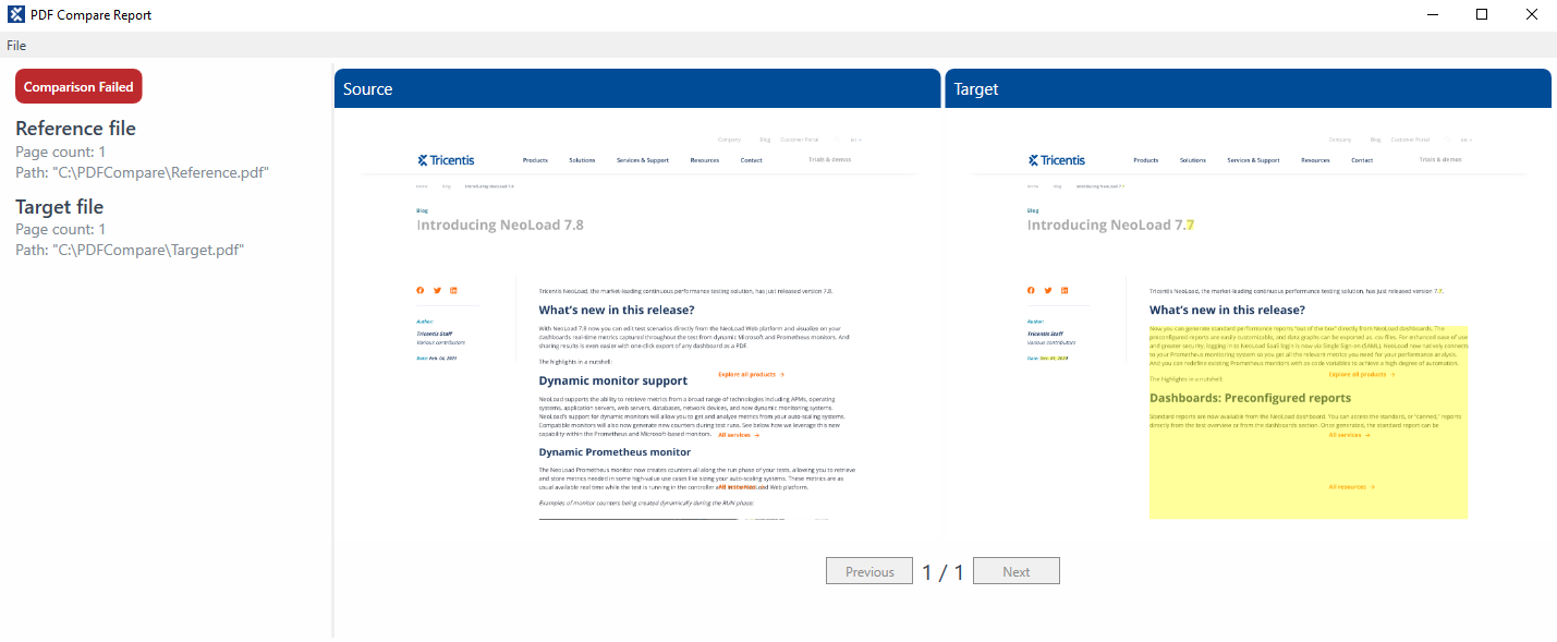 Mit der PDF Engine 3.0 können Sie eine Referenz-PDF-Datei mit einer oder mehreren Ziel-PDF-Dateien vergleichen. Verwenden Sie dazu das Modul PDF 1:1 Compare.