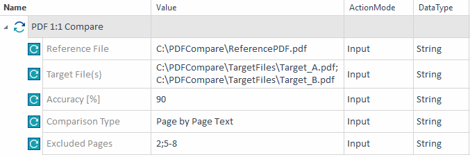 In diesem Beispiel vergleichen Sie den Textinhalt der Datei ReferencePDF.pdf mit den Dateien Target_A.pdf und Target_B.pdf. Sie erwarten, dass die Dateien zu mindestens 90 Prozent ähnlich sein sollten. Sie schließen Seite 2 und die Seiten 5 bis 8 vom Vergleich aus.