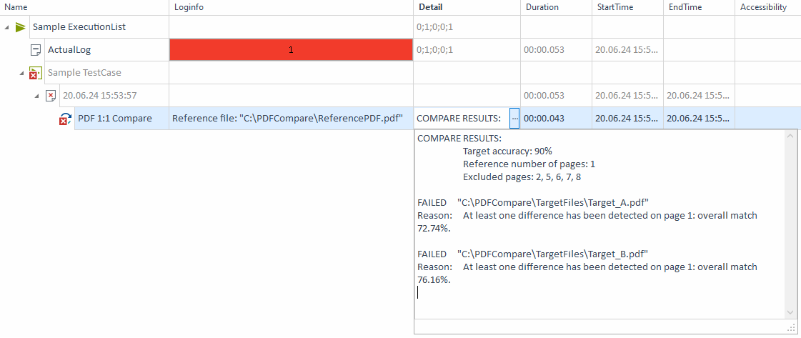 Zwei PDF-Dateien vergleichen Das Vergleichsergebnis zeigt, dass die Dateien nicht die von Ihnen angegebene Mindestähnlichkeit aufweisen. Folglich schlägt Ihr Testfall fehl.
