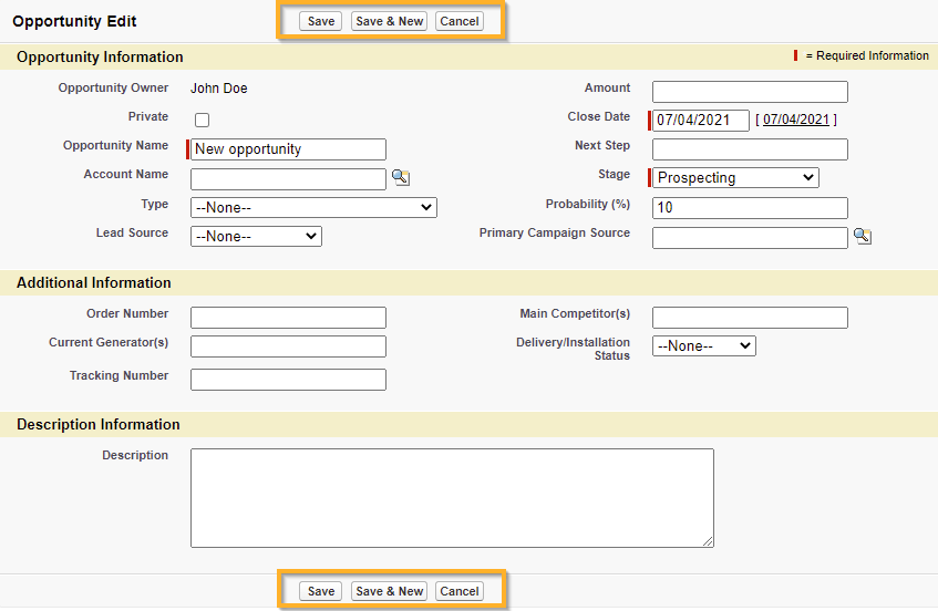 In Salesforce Classic haben Sie zwei Gruppen von Schaltflächen im Layout New/Edit: oben und unten.