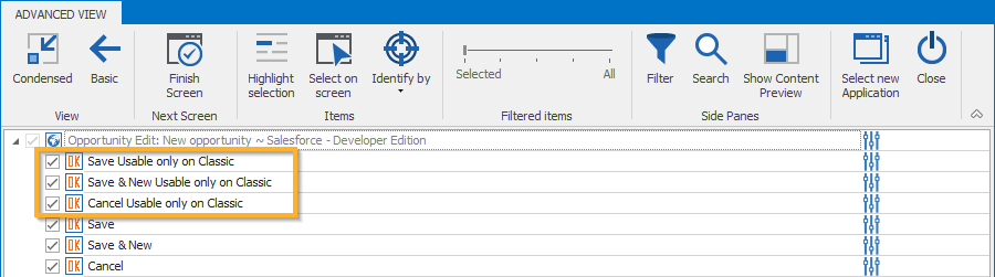 Der XScan identifiziert die Schaltflächen oben als spezifisch für Salesforce Classic. Wenn Sie sie aufzeichnen, können Sie sie nur in Ihren Salesforce Classic-Tests verwenden. Wenn Sie jedoch die Schaltflächen unten aufzeichnen, können Sie sie sowohl in Salesforce Classic-Tests als auch in Salesforce Lighting Experience-Tests verwenden.