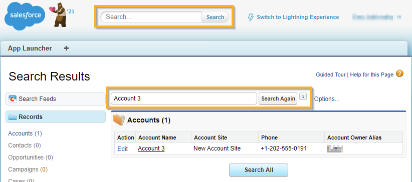 In diesem Beispiel suchen Sie nach Account 3 in Salesforce Lightning Experience. Sie möchten die Suche auf Ihre Accounts beschränken.