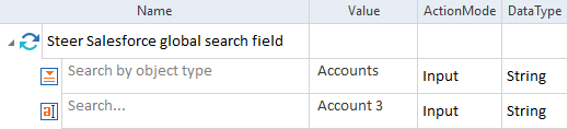 Der XScan identifiziert das globale Suchfeld in Salesforce Classic als TextBox. Sie können sie wie in Kapitel "TextBox" beschrieben steuern. In Salesforce leitet das globale Suchfeld automatisch die Suche ein. Daher müssen Sie in Ihrem Testfall keine separate Aktion angeben, die die Suche auslöst.