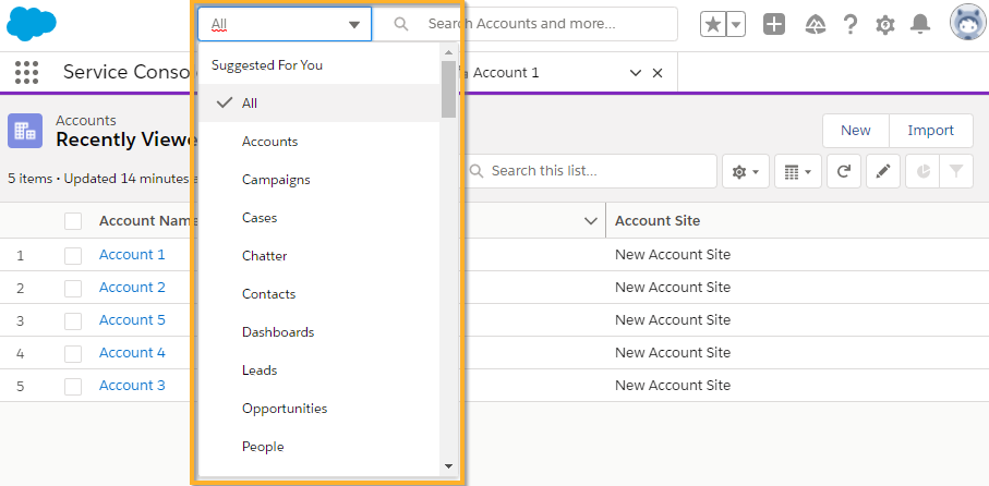 Aufklappmenü der globalen Suche in Salesforce Lightning Experience