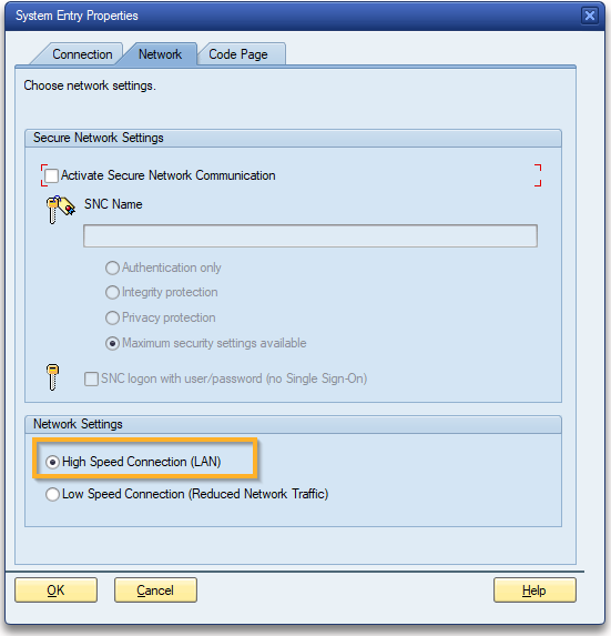 Um SAP-Applikationen zu automatisieren, müssen Sie sicherstellen, dass in den Verbindungseigenschaften die Option High Speed Connection (LAN) ausgewählt ist. Diese Option ist standardmäßig aktiviert.