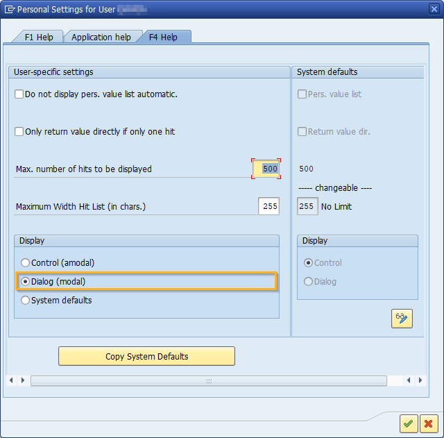 Navigieren Sie zum Reiter F4-Hilfe und wählen Sie im Abschnitt Anzeige die Option Dialog (modal) aus.