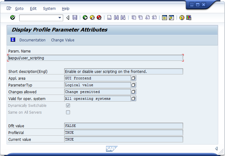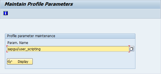 Geben Sie den Parameternamen sapgui/user_scripting ein und klicken Sie auf Display.