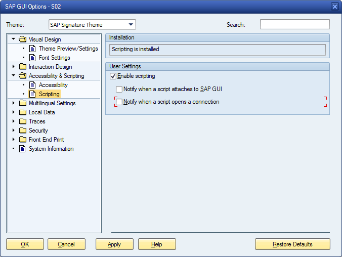 Deaktivieren Sie die folgenden Kontrollkästchen: Notify when a script attaches to SAP GUI und Notify when a script opens a connection.