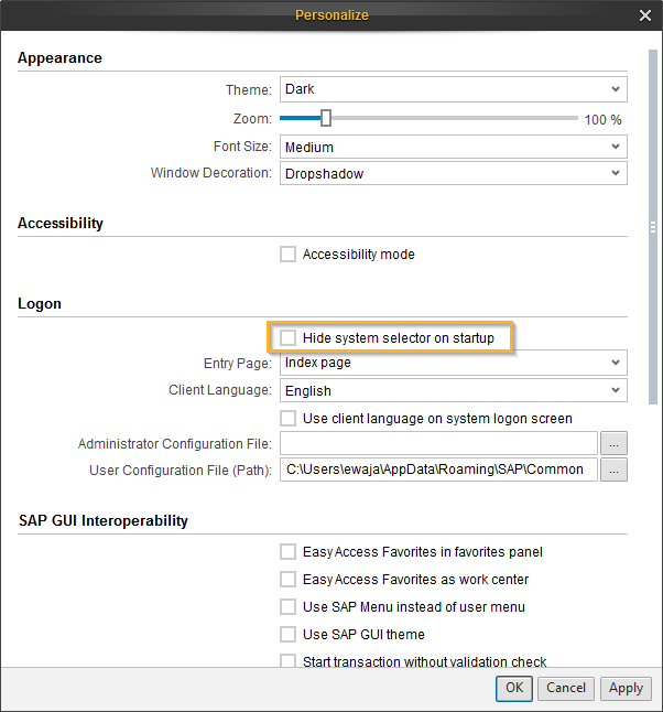 Kontrollkästchen Hide system selector on startup in den Settings des SAP Netweaver Business Client