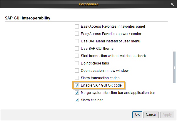 Wählen Sie das Kontrollkästchen Enable SAP GUI OK code.