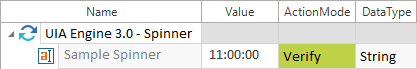 In diesem Beispiel wird verifiziert, ob der Wert 11:00:00 im Spinner Sample Spinner steht: