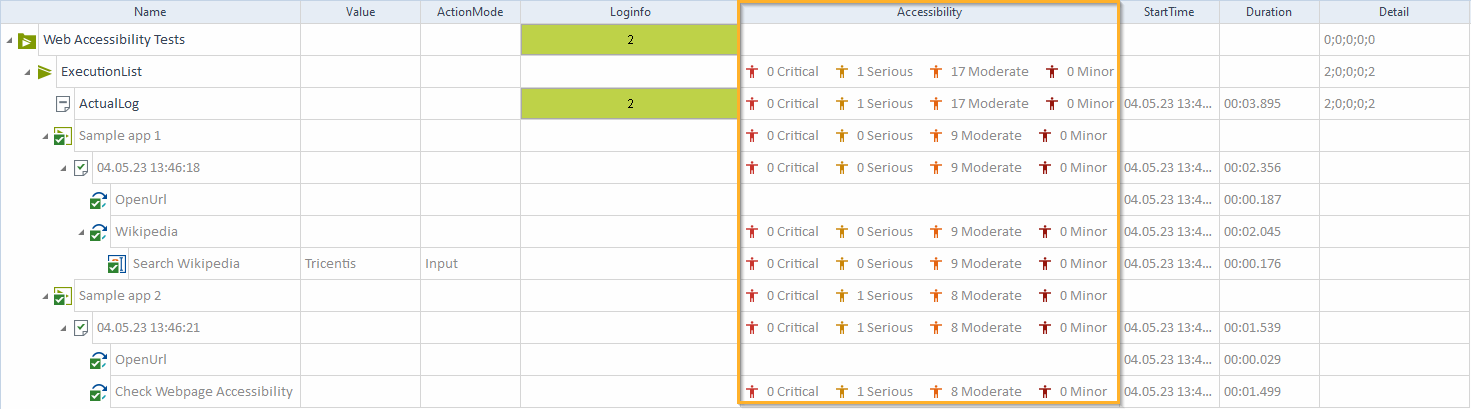 Um die Anzahl der festgestellten Probleme mit der Barrierefreiheit sowie deren Schweregrad zu ermitteln, überprüfen Sie die Spalte Accessibility auf dem Reiter Execution.