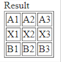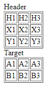 Steuerungsparameter der Kopfzeilentabelle Da die HeaderRow der Kopfzeilentabelle 2 ist, erscheint die zweite Zeile (X) aus der Kopfzeilentabelle in der Zieltabelle an der zweiten Position. Das bedeutet, dass Ihr Ziel jetzt 3 Spalten (1, 2, 3) und 3 Zeilen (A, X, B) hat.