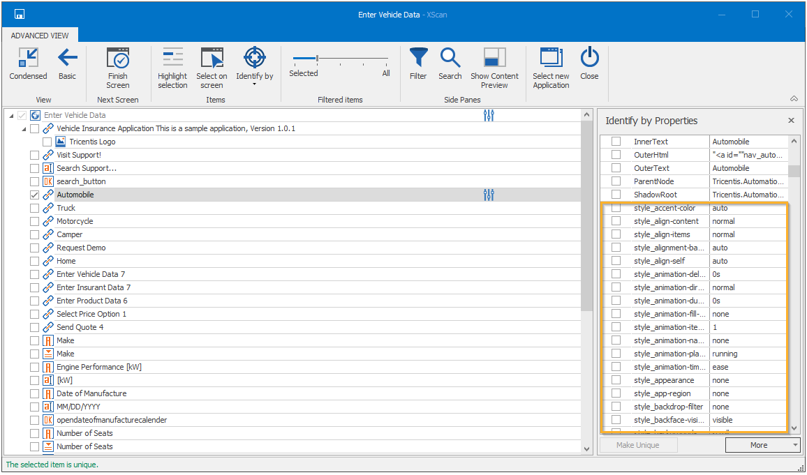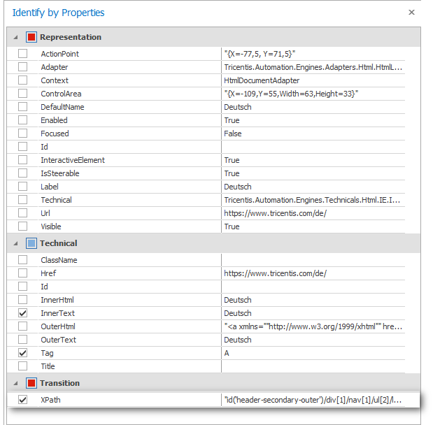 Sie können HTML-Elemente mithilfe eines XPath-Ausdrucks und des Identifikationsparameters XPath identifizieren. Der Parameter ist im XScan-Fenster unter Identify by Properties im Rasterabschnitt Transition verfügbar.