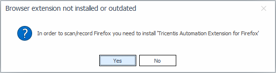 Wenn Sie keine Browsererweiterung installiert haben oder die Erweiterung veraltet ist, erscheint ein Pop-up-Fenster, wenn Sie den Tosca XScan zum Aufzeichnen von Modulen verwenden.