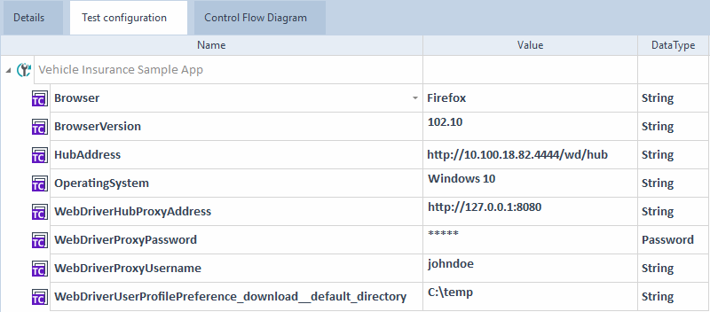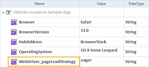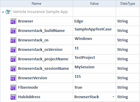 Erstellen Sie die Testkonfigurationsparameter Browser, BrowserVersion, HubAddress und OperatingSystem auf der Ebene des Testfalls, den Sie ausführen möchten.