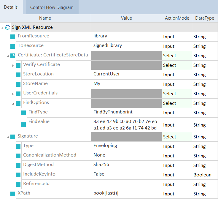 Im folgenden Beispiel wird das letzte Buch in der Resource library signiert und das Ergebnis in der Resource signedLibrary hinterlegt. Dazu wird der Schlüssel im Modulattribut FindOptions per Thumbprint aus dem benutzerspezifischen Zertifikatspeicher geholt. Die Signatur wird mit enveloping erstellt. Das signierte Objekt ist das letzte Buch, das mittels des XPath book[last()] gefunden wird.