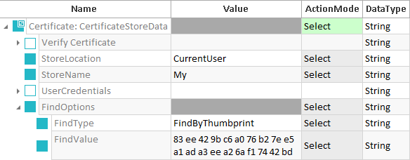 In diesem Beispiel wird ein Zertifikat im Speicher My innerhalb des benutzerspezifischen Zertifikatspeichers CurrentUser angegeben. Identifiziert wird es über seinen Thumbprint, in dem der Wert des Modulattributs FindType auf FindByThumbprint gesetzt wird und das Modulattribut FindValue mit dem konkreten Wert für den Schlüssel definiert wird.