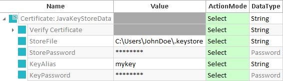 Im Beispiel wird mit dem Testschrittwert StoreFile der Pfad zur Keystore-Datei definiert. Das Passwort für den KeyStore wird mit StorePassword und die Zugangsparameter zum Schlüssel mit KeyAlias und KeyPassword definiert.